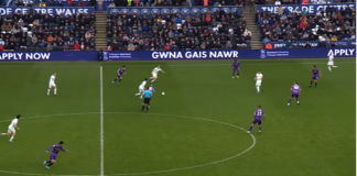 Video: Swansean Liam Cullen laukoi eleettömän maalin puolesta kentästä Englannin Mestaruussarjassa