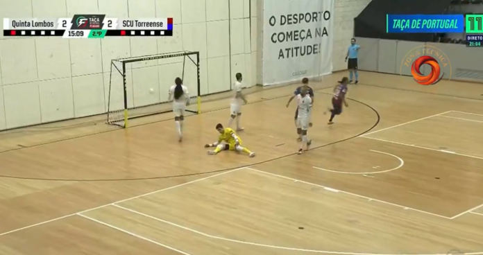Vierasjoukkue SCU Torreense meni toisen jakson alkupuolella 2–3-johtoon – ja upealla tavalla menikin. Maalivahti heitti pallon Célio Coquelle, joka otti pallon haltuunsa, harhautti pakin ja lopulta laittoi hienon jalkapohjamaalin.