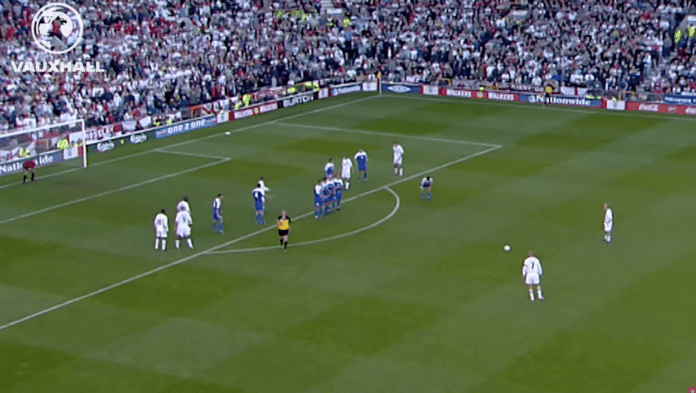 Beckham täräytti täydellisellä laukauksella pallon aivan Kreikan maalin yläkulmaan, lähettäen Englannin MM-kisoihin. Alla olevan videon epäkiihkeää selostusta on pidetty Englannissa häpeällisenä suorituksena.