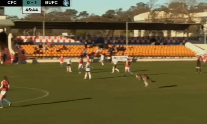 Jalkapallosta ainakin jonkin verran kiinnostunut kenguru säntäsi kentälle kesken Canberra FC:n ja Belconne Unitedin välisen divariottelun kesällä 2018.