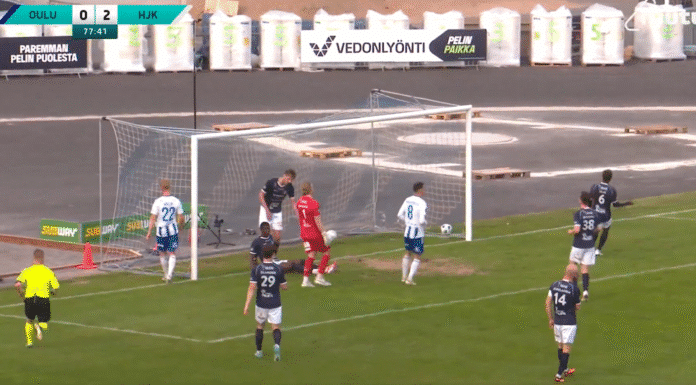 Varsin tavanomainen tilanne, mutta erotuomari Oskari Hämäläinen laittoi pallon pilkulle Yakubun käsivirheen takia. Owoeri laukoi rankkarin varmasti sisään.