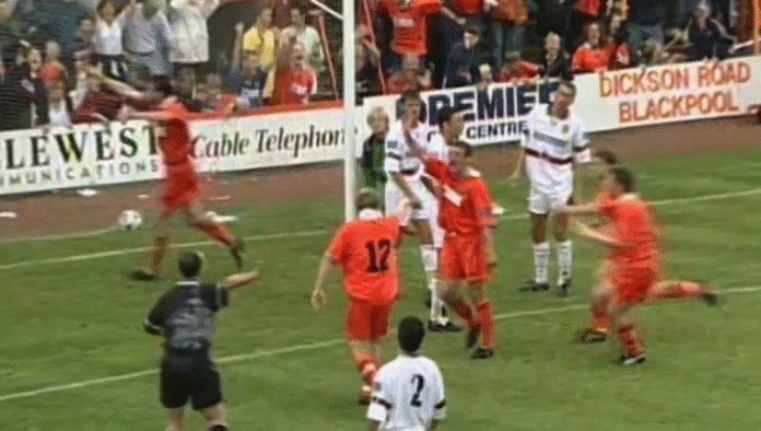 Ottelun 71. minuutilla nähtiin harvinainen, jopa ainutlaatuinen osuma. Blackpool hyökkäsi, ja lopulta pallo ajautui rankkarialueella tuolloin 29-vuotiaalle Phil Clarksonille, joka yllätti kaikki.
