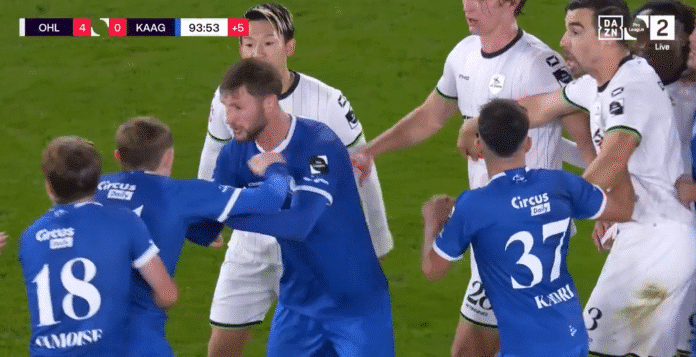Ja sitten 94. minuutilla Dean sukitti takaapäin Oud-Heverlee Leuven pelaajaa. Erotuomari jakeli suoran punaisen kortin, jonka jälkeen joukkuetoverit rauhoittelivat tulistunutta Deania.