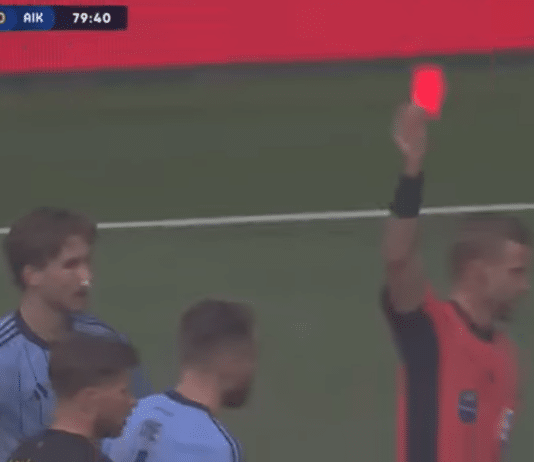 30-vuotias Djurgårdenin keskuspuolustaja Miro Tenho joutui katselemaan punaista korttia Ruotsin pääsarjassa.