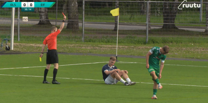 Ottelu sai ison käänteen 36. minuutilla, kun OLS:n Onni Suutari pelattiin puolittaiseen läpiajoon. Suutari siirsi pallon ohi EIF-maalivahdin ja filmasi kömpelösti. Hänellä oli jo keltainen alla, ja tuosta tilanteesta tuli toinen, joten suihkukomennushan siitä tuli.