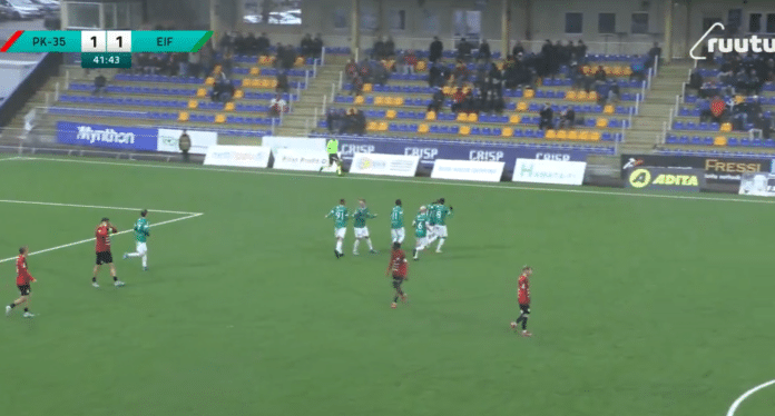 Ottelun voittomaaliksi jäänyt 1–2-osuma 42. minuutilla oli näyttävä. EIF sai kulmapotkun, jonka PK-35:n puolustus sai puskettua kauemmaksi, mutta rankkarialueen ulkopuolella päivystänyt Robin Sid laukoi eleettömän kauniilla roikotuksella pallon reppuun.