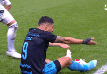 Katso videosta, miten pallo imeytyy ylänurkkaan, kun ”Dinho” laittaa munkin liitoon.