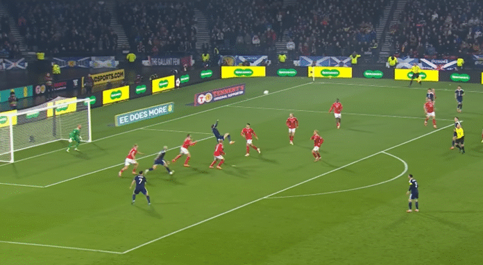 Heti ottelun 3. minuutilla nähtiin loistelias maali. Skotlannin Ben Gannon-Doa keskitti rankkarialueelle, missä Scott McTominay pamautti pallon saksipotkulla maaliin, 1-0!