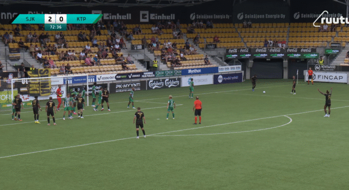 Sitten 73. minuutilla nähtiin loistelias maali. SJK sai vapaapotkun pienestä kulmasta lähellä KTP:n päätyrajaa, ja Babacar Fati tykitti kaikkien yllätykseksi pallon voimalla yläriman kautta sisään, 3-0!