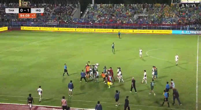 Irakin Ali potkaisi todella rumasti Thaimaan kapteenia Chanathip Songkrasinia. Erotuomari näytti Alille saman tien punaista korttia, ja samalla Thaimaan pelaajat tulivat tönimään häntä. Pian kentällä alkoi iso nahina.