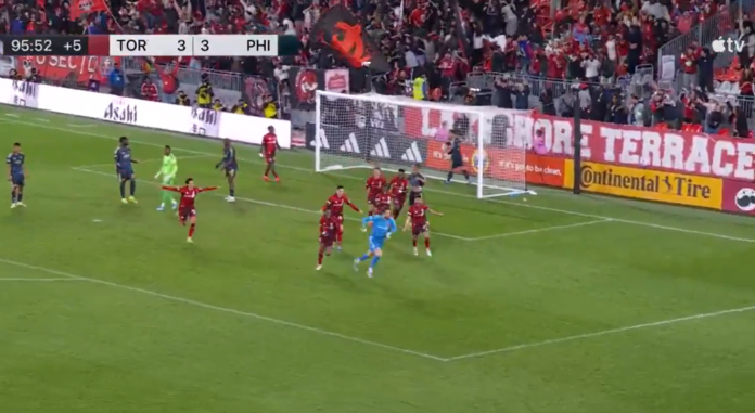 Ottelu oli jo päättymässä vierasjoukkue Philadelphia Union vierasvoittoon, mutta 96. minuutilla nähtiin tasoitus. Toronto FC sai vapaapotkun, ja ylös noussut maalivahti Luka Gavran puski Alonso Coellon keskityksen sisään, 3-3!