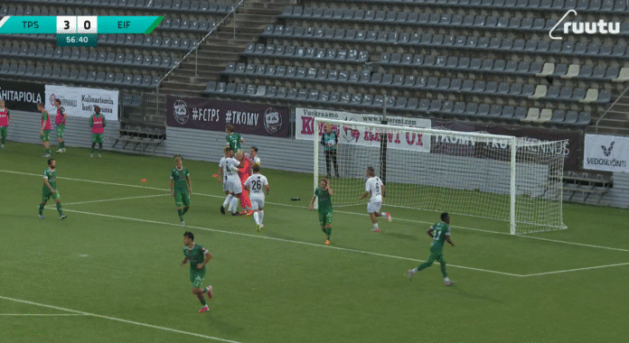 Vierasjoukkue EIF sai rankkarin 3–0-tilanteessa. Salomo Ojala laukoi pilkun, mutta Lauri torjui upeasti. Pian tuon jälkeen TPS sai puolestaan rankkarin ja meni 4–0-johtoon.