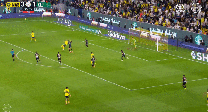Ottelun lisäajalla nähtiin loistelias maali. Al Nassr hyökkäsi vielä kerran, ja pallo pelattiin oikealta laidalta rankkarialueelle, missä ikinuori Cristiano Ronaldo tällä saksipotkumaalin!