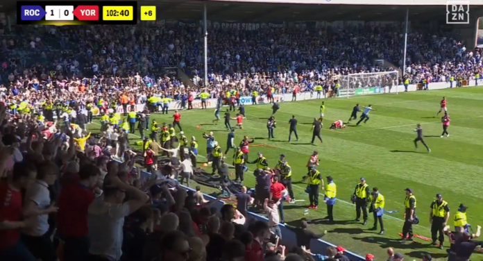 Ottelu eteni kiikarilukemissa lisäajalle saakka, ja lisäaikaa annettiin 8 minuuttia. Sitten Rochdalen kotiyleisö pääsi juhlimaan, kun Emmanuel Dieseruvwe teki 1–0-maalin 95. minuutilla. Nousujuhlat olivat viittä vaille valmiina!