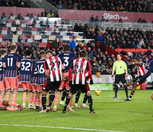 27-vuotias Brentford-tähti Ivan Toney palasi pitkän pelikiellon jälkeen kehiin ja laukoi saman tien pallon maaliin.