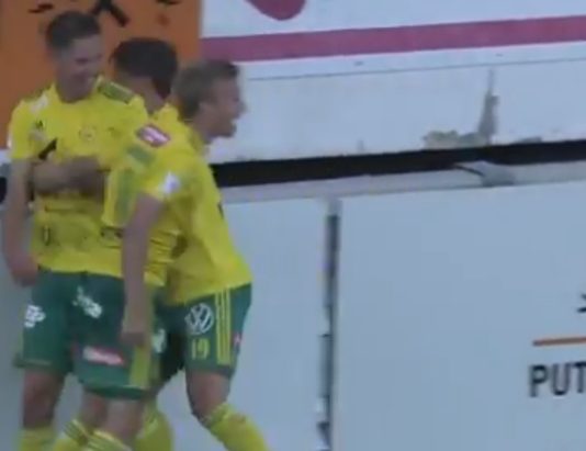MYPA-pelaaja Kevin Larsson laukoi viikonloppuna tyylikkään osuman suoraan syötöstä Ykkösen ottelussa.