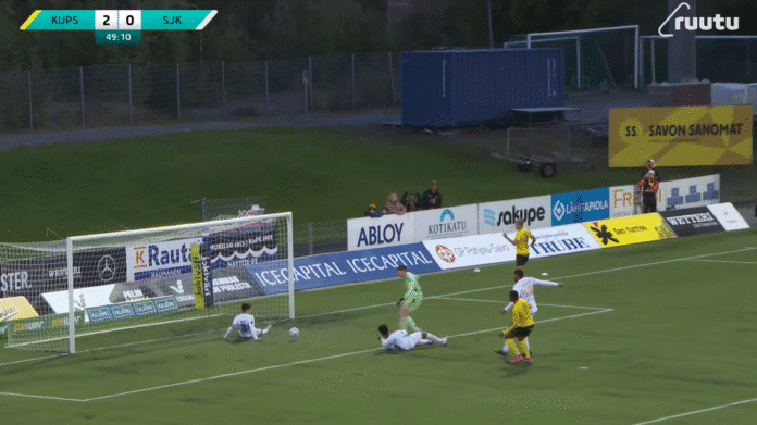 SJK:n 24-vuotias argentiinalaispelaaja Valentín Gasc suoritti todella tyylikkään pelastuksen, jolla hän esti KuPS:n varman maalin.