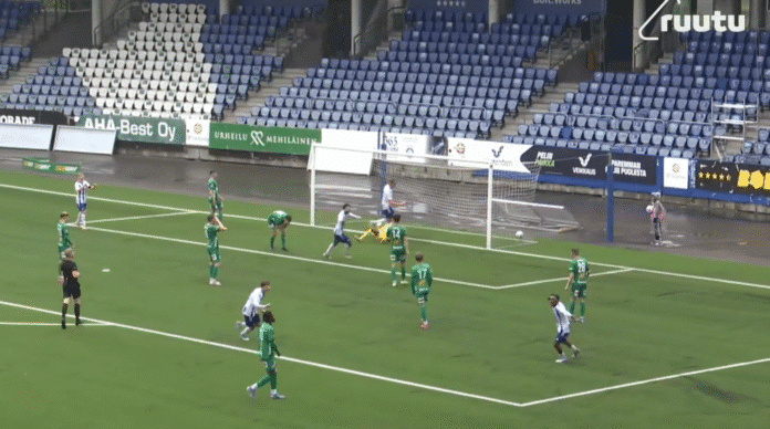 Ottelun voittomaaliksi jäänyt 2–1-osuma syntyi toisen jakson alussa – ja se oli lahja. Klubi 04 hyökkäsi ja pallo pelattiin maalinedustalle, missä IFK Mariehamin Max Thulani Peterson yritti purkaa, mutta sijoitti pallon omiin.